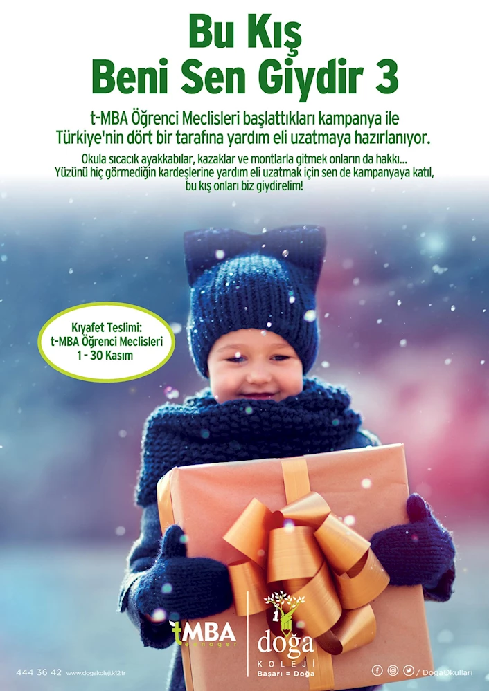 t-MBA Öğrenci Meclisi bu yıl üçüncüsünü gerçekleştirecekleri ?Bu Kış Beni Sen Giydir? sosyal sorumluluk projesi için yine çok heyecanlı! Eğitim hayatını güç şartlarda sürdüren çocuklar için önemli bir sosyal sorumluluk projesi hayata geçirmeye hazırlanan Osmaniye Doğa Koleji t-MBA Öğrenci Meclisi, bu proje ile dar gelirli öğrenci kardeşlerine yardım eli uzatmak için çalışmalara başladı.