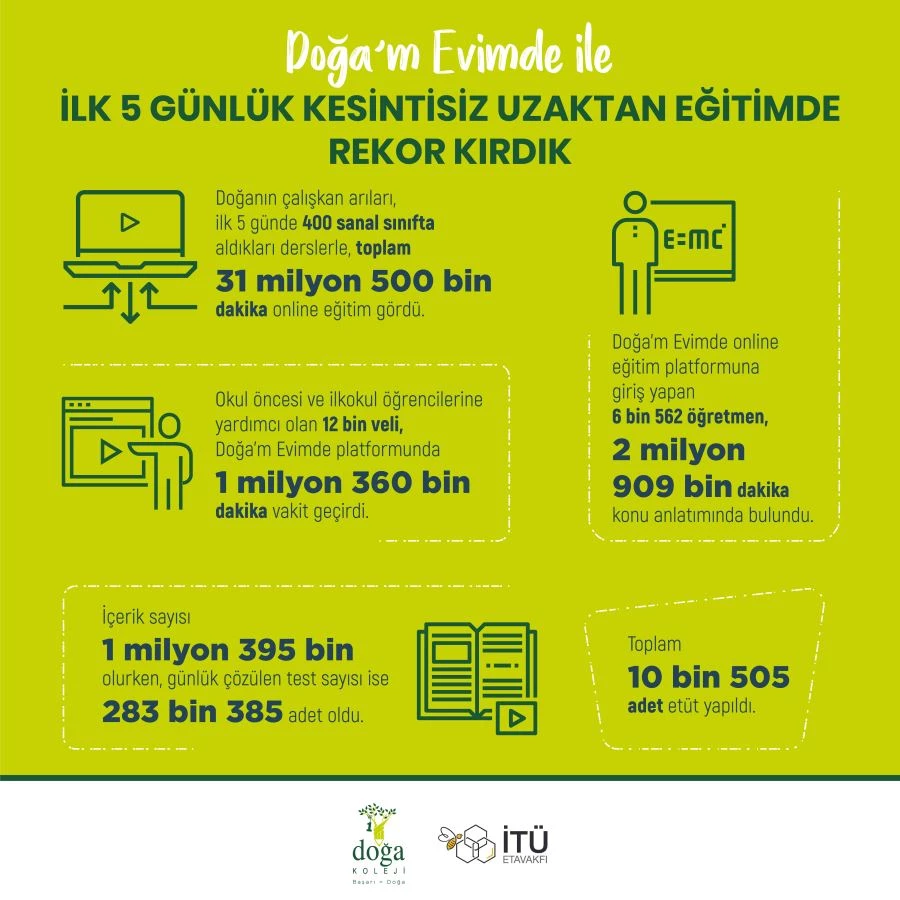 Eğitim yönetim sistemleri üzerinden evden eğitim faaliyetlerini sürdüren Doğa Koleji, 400 adet sanal sınıfında, öğrencileriyle günde ortalama 3 bin 600 saat canlı derslerde bir araya geldi. Doğa öğrencilerinin, evden eğitimin ilk 5 günündeki online eğitim süresi 31 milyon 500 bin dakikayı buldu.