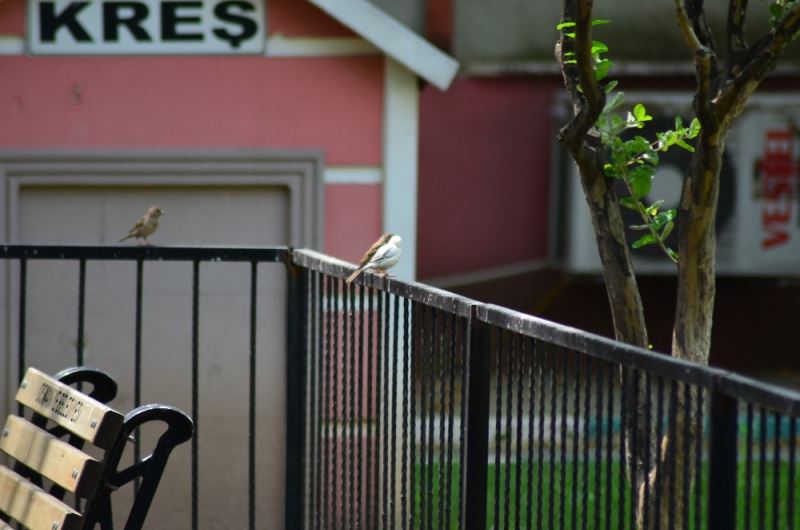 Farklı görüntüsüyle hemen dikkat çeken beyaz serçeyi görenler ilgiyle izledi.