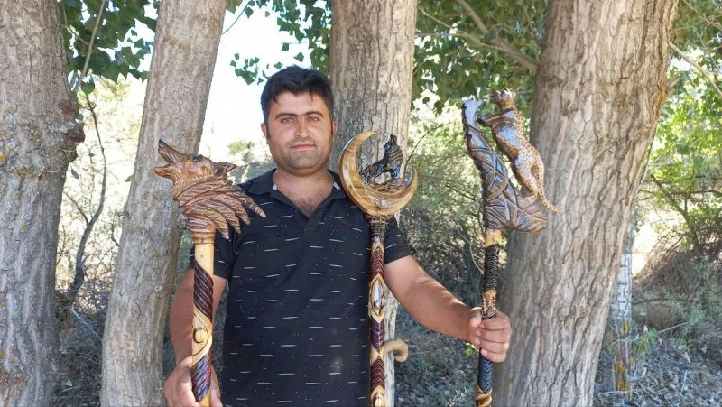 Yozgat’ta kuş, kurt, aslan, leopar gibi hayvan figürlerini ceviz ve gürgen dallarına işleyerek birbirinden değişik ve farklı özelliklere sahip baston ve asa üreten Müslüm Bükücü, görenlerin beğenisini kazanıyor.