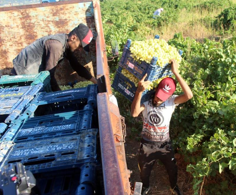 Sabahin erken saatinden itibaren genellikle kadin isçiler tarafindan toplanan üzümler, sandiklara yerlestirildikten sonra nakil için hazir hale getirilip, araçlara yüklenerek satisa gönderiliyor.