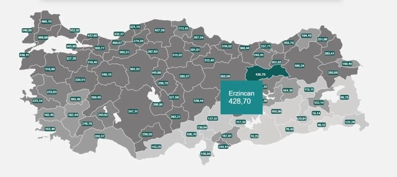 Sağlık Bakanlığı, illere göre 7 gün her 100 bin kişide görülen korona virüs güncel vaka sayılarını yayımladı. Erzincan 428,70 ile Doğu Anadolu Bölgesi’ndeki 14 il arasında vaka sayısının en yüksek olduğu kent oldu.