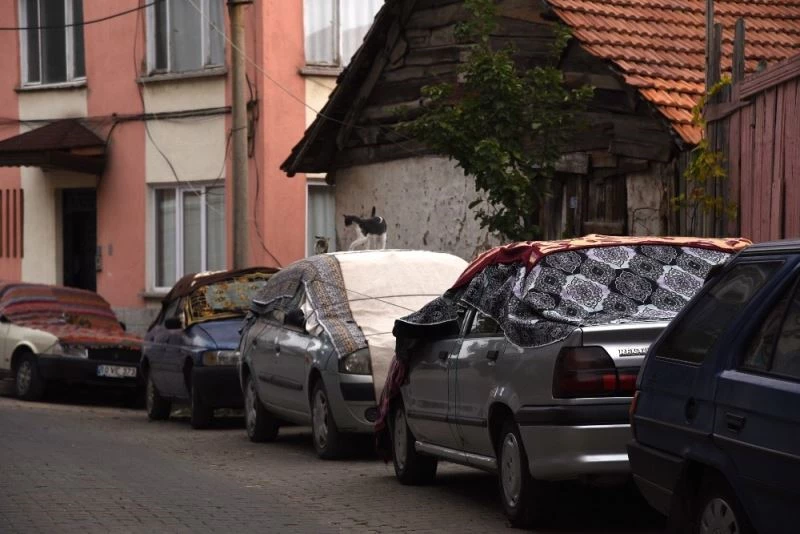 Öte yandan üzeri kapatılan araçlara çıkan kediler, ilginç görüntülere sahne oldu. Kediler halı ile kapalı araçların üzerine yatarak keyif yaptı.