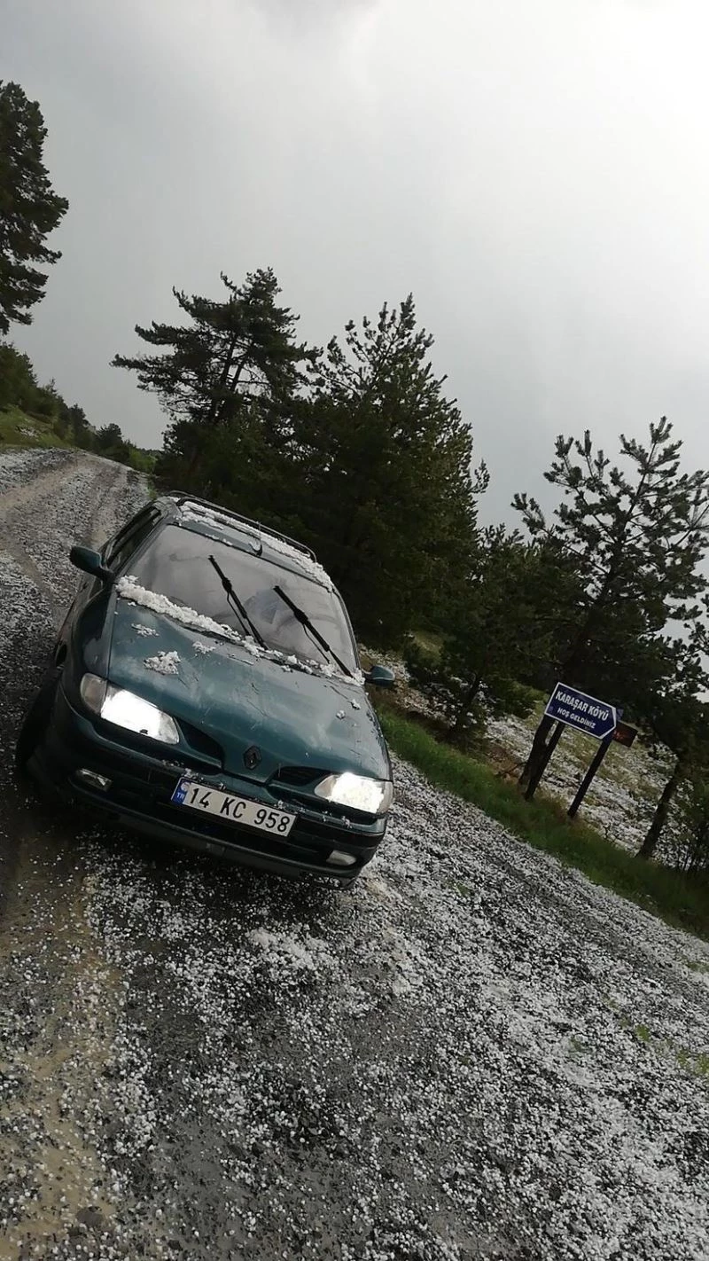 Karabük’ün Eskipazar ilçesinde fındık büyüklüğünde dolu yağdı. İlçeye bağlı Karaşar köyünde başlayan yağmur yerini doluya bıraktı. Yollardaki sürücüler, zor anlar yaşadı. Yağan dolu sonrası bölge beyaza büründü. Bir sürücü otomobilinin üzerini ve bölgeyi beyaza bürüyen doluyu cep telefonu kamerasıyla görüntüledi.