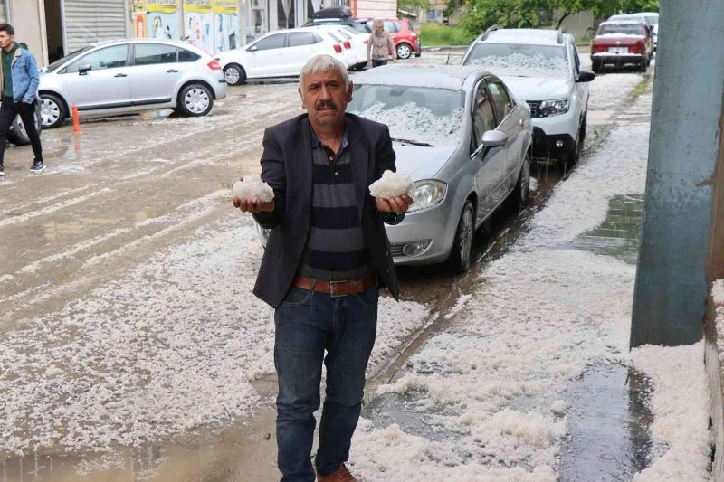 Öğle saatlerinde aniden başlayan dolu yağışı ilçe merkezinde hayatı olumsuz etkiledi. İlçede ekili alanlar doludan zarar gördü. 10 dakika süren dolu yağışı, ilçe merkezini beyaza bürüdü