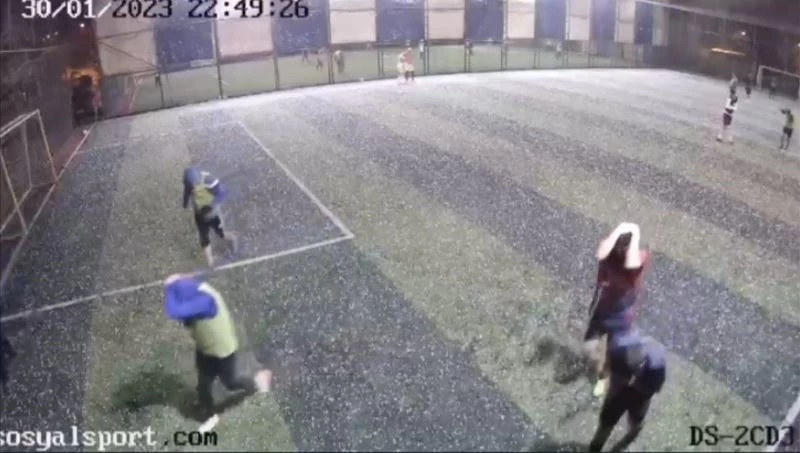 Antalya’nın Manavgat ve Serik ilçelerinde etkili olan doluya halı sahada yakalanan oyuncular, adeta kaçacak yer aradı. Bir anda bastıran bilye büyüklüğündeki doludan önce ellerini başlarının üzerine koyarak kurtulmaya çalışan oyuncular, bu yeterli olmayınca sahayı koşarak terk etti.