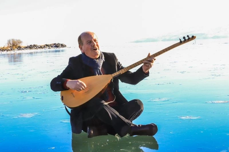 Aşık Yener Yılmazoğlu, donan Çıldır Gölü üzerinde saz çalıp türkü söyledi.