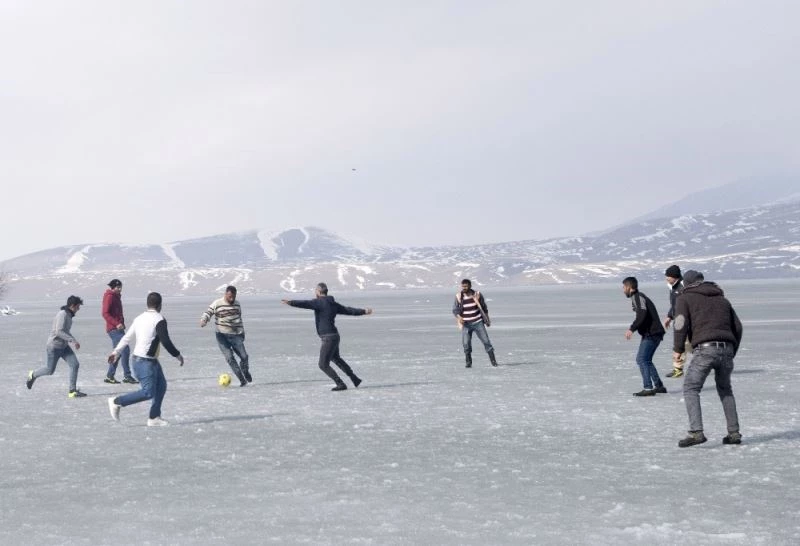 Ahlat ilçesinde bağlı Dilburnu köyündeki çocuklar ve gençler, yaklaşık 20 santimetre kalınlığında buz tutan Nazik Gölü üzerinde gün boyu futbol maçı yaparak doyasıya eğleniyor. Donan göl üzerinde futbol oynayan gençlerden Mehmet Oğur, kış mevsimi boyunca donan gölde futbol oynayarak boş zamanlarını değerlendirdiklerini söyledi. Mehmet Oğur, “Bitlis’in Ahlat ilçesinin Dilburnu köyünde oturuyorum. Biz burada normalde balıkçılık yapıyoruz. Aralık ayından sonra yılbaşına doğru buralar buz tutuyor. Buz tabakası bu sene 20 santimetre oldu. Normalde 40-50 santimetre kalınlığında buz oluyor ama bu sene hava sıcak geçtiği için 20 santimetreye yakın tuttu. Köylü çocuklar ve gençler olarak donan göl üzerinde top oynuyoruz” dedi.