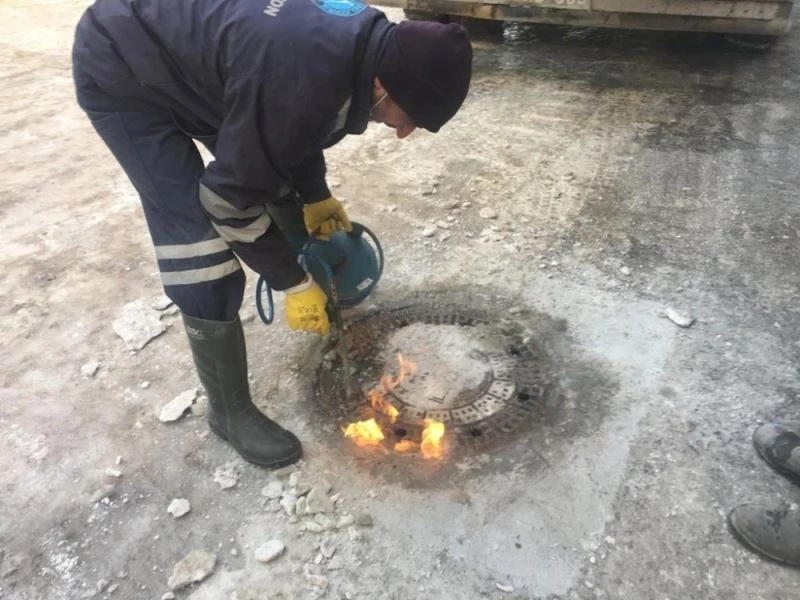 Hakkari Belediyesi Su ve Kanalizasyon Müdürlüğü ekipleri, donan kanalizasyon kapaklarını pürümüz yardımıyla açtı.