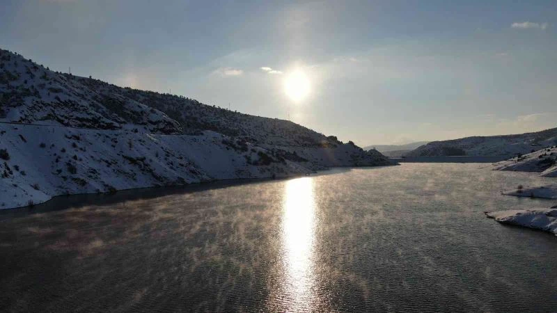 Sibirya soğuklarının yaşandığı Sivas’ta her gün ortaya çıkan farlı bir kış güzelliği doğaseverleri mest ediyor. Sivas’ın Hafik ilçesinde bulunan Pusat barajında dondurucu soğuğun etkisi ile su yüzeyinde oluşan buharlaşma gün batımı ile birleşince ortaya izlemeye doyulmayan görsel bir şölen çıktı. Baraj yüzeyindeki ışık kırılmaları ve buhar tarlası havadan da görüntülendi.