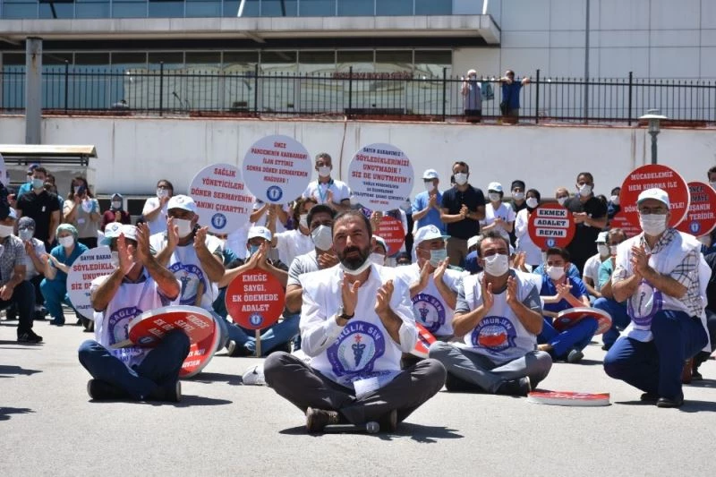 Bugün Almanya’da bir hemşirenin en az aylık 15 bin Türk Lirası’na karşılık gelen ücret almakta olduğunu belirten Yünkül, "Bu rakam Amerika’da 38 bin, Katar’da 35 bin, Avustralya’da 33 bin, İngiltere’de ise 60 bin Türk Lirasını bulmaktadır. Buraları neden örnek veriyoruz? Çünkü, örnek gösterdiğim ülkelerden 4 kat daha fazla hasta yoğunluğuna sahip olan sağlık sistemimizde salgın sürecinde ortaya konan başarı bu kıyası fazlasıyla yapmaya hakkımız olduğunu gösteriyor. Oysa ki bugün yaşanan tablo o kadar dramatik bir hal adı ki, akıllara zarar. Bakınız, geçen ay salgından dolayı tavandan dağıtım yapılması nedeniyle ek ödeme olarak bin 100 TL alan bir hemşire arkadaşımız bu ay 75 kuruş ek ödeme almıştır. Yani bu arkadaşımızın bin 100 liralık kazancına el konulmuştur. Her ay sistematik bir şekilde sağlık çalışanlarımız unvanlarına göre 500 TL ile 5 bin TL arasında hak kaybına uğramaktadır. Şimdi buradan sesleniyoruz. Adalet bunun neresinde, hakkaniyet bunun neresinde, bu yaşananlar ayıp değil mi? Günah değil mi? Bunlar sadece bir kaç örnek. Genel idari hizmetlerdeki arkadaşlarımız, sağlık hizmetlerinde görevli hemşiremiz, ebemiz, laborantlarımız, anestezi teknisyenlerimiz ve diğer arkadaşlarımız döner sermayeden neredeyse hiç pay alamıyor, hekim arkadaşlarımız ise her ay binlerce liralık hak kaybına uğruyor. Sağlık Bakanlığının etkili ve yetkili idarecilerine sesleniyoruz. Sizin adaletiniz bu mu? Bu haksızlığa, bu hukuksuzluğa, bu hak gasbına dur diyecek bir idarecimiz yok mu? Döner sermayenin canı çıkmıştır, bizim de öyle. Bizler artık her ay ne kadar döner sermaye yatacak endişesi taşıdığımız hiç bir sağlık çalışanının memnun olmadığı, bu bitmiş-gitmiş ek ödeme düzeninden artık illallah ettik. Tekrar ediyoruz; insanca yaşayacağımız, alın terimizin karşılığının her ayın 15’inde maaş olarak ödendiği, aldığımız tüm ücretin emekliliğimize yansıdığı bir yepyeni sistem istiyoruz. Canını dişine takarak gece gündüz çalışan sağlık çalışanlarımız bunu fazlası ile hak ediyor. Evet, bizler takdiri hak ediyoruz. Ama takdir olarak kuru ve hatta artık unutulmuş alkış seslerini değil alın terimizin karşılığını istiyoruz. Bursa Sağlık-Sen Şubesi olarak örgütsel gücümüzü eylemselliğe dönüştürüyoruz. Bugün burada bir oturma eylemi yapıyoruz. Gündemi değiştiriyoruz. Gündemin gerçek sahiplerine dikkat çekmek istiyoruz. Bundan sonraki süreçte de sağlık çalışanlarımızın gür sesi olarak farklı eylemlere, farklı sağlık tesislerimizde devam edeceğiz" şeklinde konuştu.