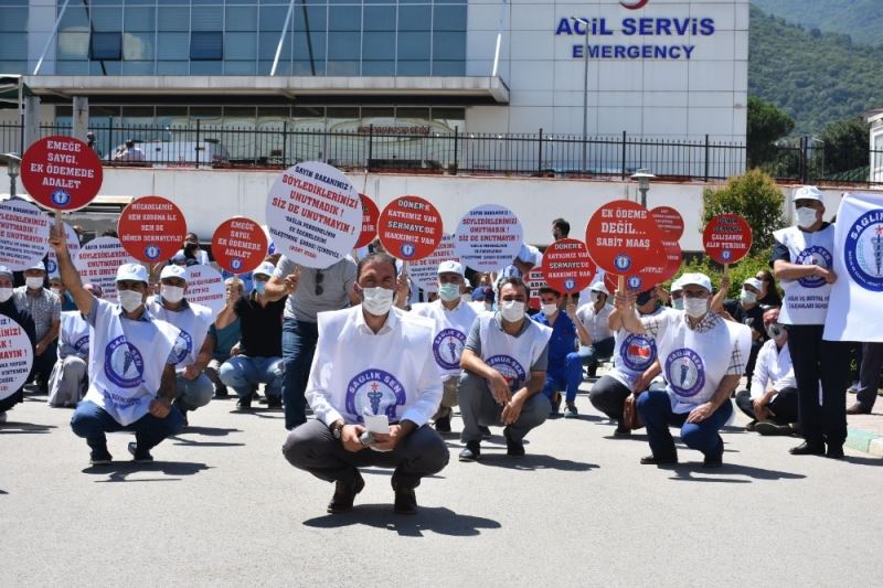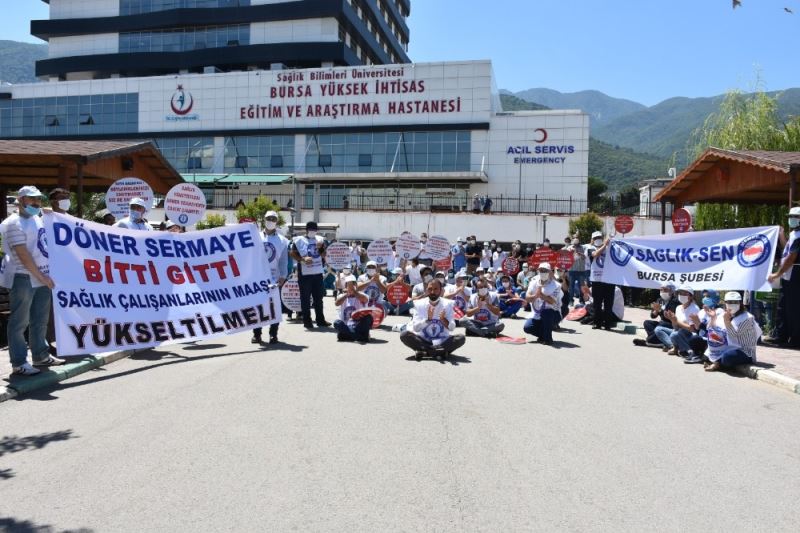 Memur Sen’e bağlı Sağlık-Sen Bursa Şubesi üyeleri, döner sermaye (ek ödeme) sistemini oturma eylemi yaparak protesto etti.