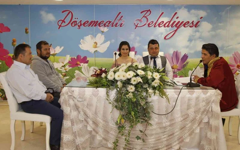 Özel tarihte nikah kıymak isteyen çiftlerin işlemlerini yapan Döşemealtı Belediyesi nikah memurları, başvuru yapan 4 çiftin nikahını kıyarak mutlu günlerini atılan imzayla ölümsüzleştirdi.