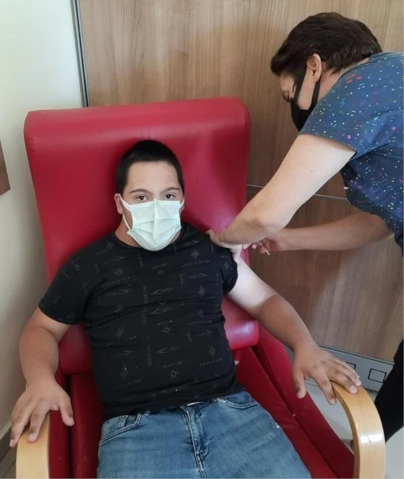 Kırşehir’de, ’Haydi Kırşehir Sana Mavi Yakışır’ sloganı ile başlatılan aşılama kampanyasında down sendromlu Yusuf Gökbayrak ilk doz aşısını oldu.