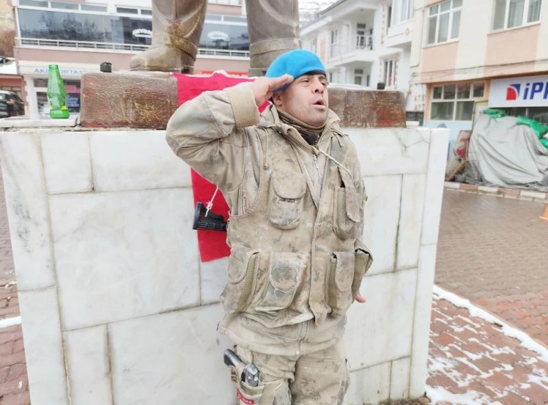 Tunceli’de Down sendromlu 36 yaşındaki Kemal Karakoç, komando kıyafeti giyip elinde bayrakla gezerek vatan sevgisini gösteriyor.
