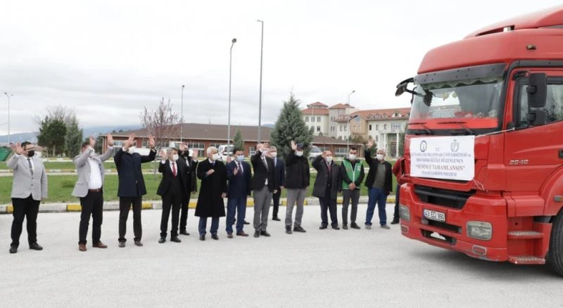 Kütahya Dumlupınar Üniversitesinin Suriye’nin İdlib kentindeki ihtiyaç sahipleri için başlattığı “Seninle Tamamlansın” adlı yardım kampanyasıyla toplanan 185 bin TL değerindeki yardım malzemeleri, düzenlenen törenle yola çıktı.