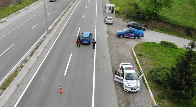DÜZCE(İHA) – Düzce İl Jandarma Alay Komutanlığı ekipleri şehrin giriş ve çıkışlarında drone destekli tam kapanma denetimlerini sürdürüyor.