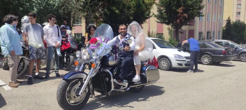 Bursa’da motosiklet tutkunu çift, düğünlerinde motosikletlerini düğün aracı yaptı. Çiftin onlarca motorcu arkadaşı da düğün alayına katıldı.