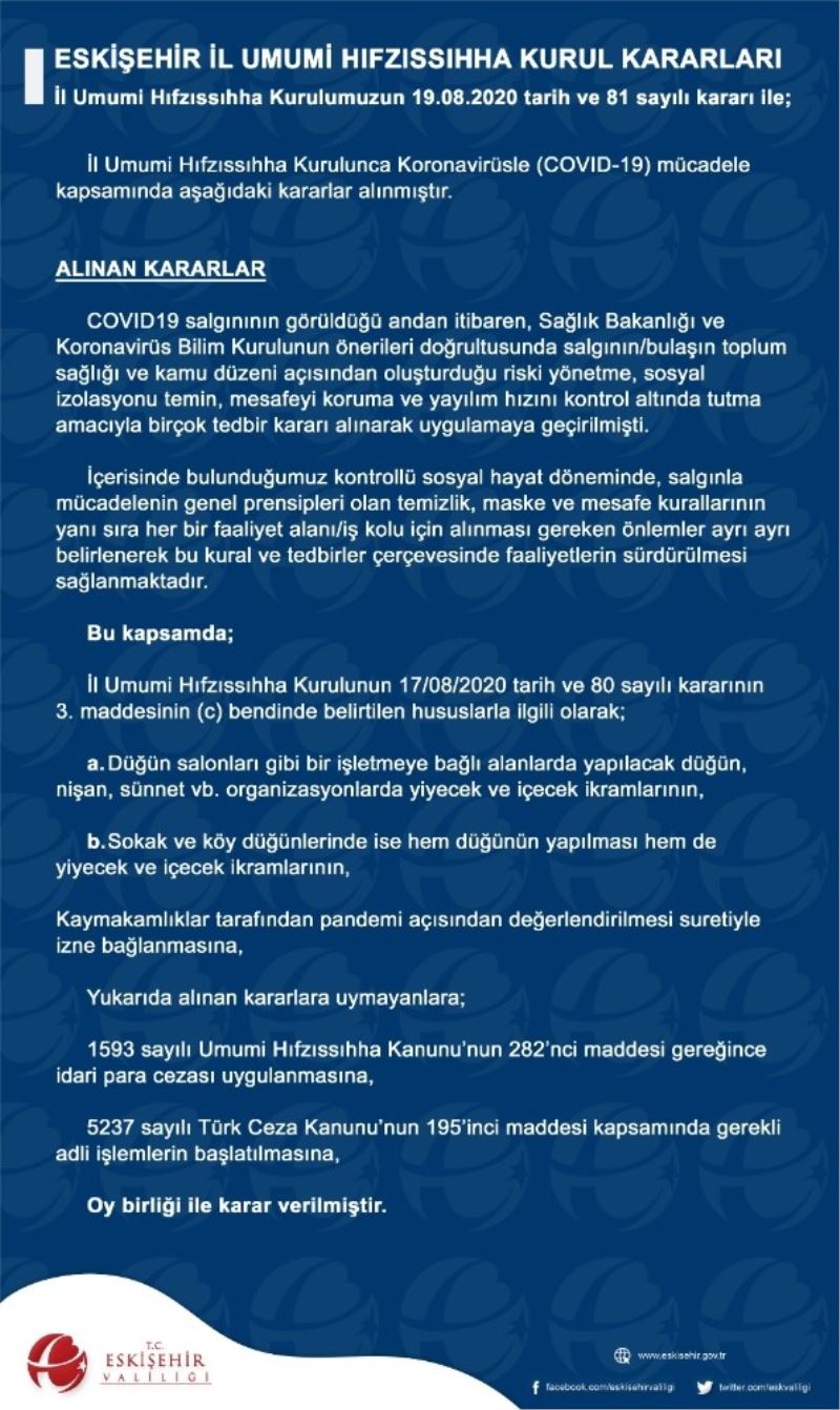 Eskişehir Valiliği İl Umumi Hıfzıssıhha Kurulu, düğün salonu, sokak ve köy düğünlerinde yiyecek ve içecek ikramlarının sunması için ilgili kaymakamlıktan izin alınması gerektiği yönünde karar aldı.