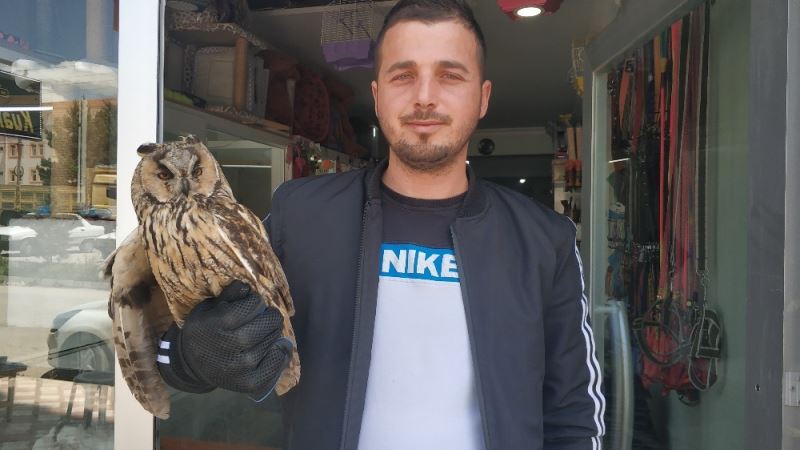 Amasya’da yaralı baykuş pet shopa sığındı.