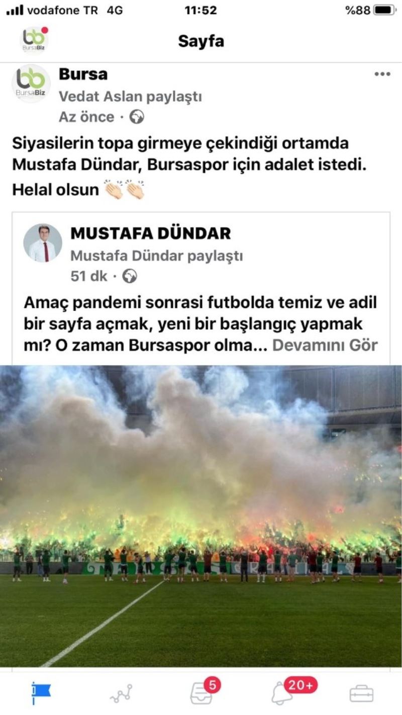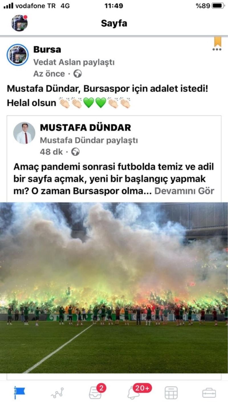 Bütün futbol kamuoyu federasyondan adaletli bir karar beklerken Başkan Dündar’ın sosyal medya üzerinden yaptığı "Amaç pandemi sonrası futbolda temiz ve adil bir sayfa açmak, yeni bir başlangıç yapmak mı? O zaman Bursaspor olmadan asla olmaz, Bursaspor olmadan Süper Lig olmaz" paylaşımı kısa sürede paylaşım rekorları kırdı. Birçok taraftar platformunda paylaşılan çağrı yarım milyondan fazla etkileşim aldı.