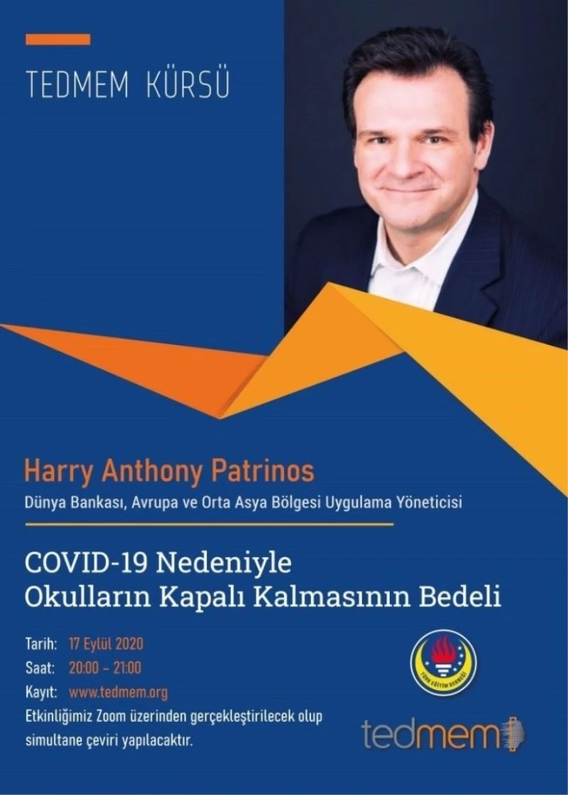 Çin’in Vuhan kentinde ortaya çıkan ve kısa sürede tüm dünyayı etkisi altına alan Covid-19 salgını, ülkelerin sağlık sistemlerini etkilediği kadar eğitim alanında da önemli kayıplara sebebiyet verdi. Türkiye’de de okulların yüz yüze eğitime hazırlandığı 21 Eylül itibarıyla alınması gereken önlemler ve konuya ilişkin yorumlarıyla Dünya Bankası Avrupa ve Orta Asya Bölgesi Uygulama Yöneticisi Harry Anthony Patrinos, TED’in düşünce kuruluşu TEDMEM’in konuğu olacak. ‘Covid-19 Nedeniyle Okulların Kapalı Kalmasının Bedeli’ başlığıyla düzenlenecek oturumda Patrinos, gelen soruları da yanıtlayacak. 17 Eylül günü 20.00-21.00 saatleri arasında zoom üzerinden gerçekleştirilecek toplantıda simultane çeviri de yapılacak.