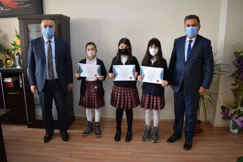 Uluslararası “Owlypia Intellectuals Challenge” yarışmalarında dereceye giren öğrenciler, Milli Eğitim Müdürü Fatih Türköz’ü ziyaret etti. Dünya birincisi olan İpek Çiftçi ve Göksu Zeyrek ile dünya üçüncüsü olan Ülkü Deren Can’ı kutlayan Milli Eğitim Müdürü Fatih Türköz, hediye takdiminde bulundu.