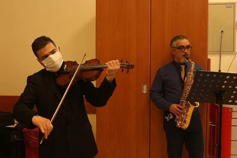 Ferit Ginol Kültür ve Sanat Merkezi’nin katkılarıyla düzenlenen müzik dinletisiyle moral bulan hastalara, Prof. Dr. Yıldırım tarafından karanfil takdim edildi.