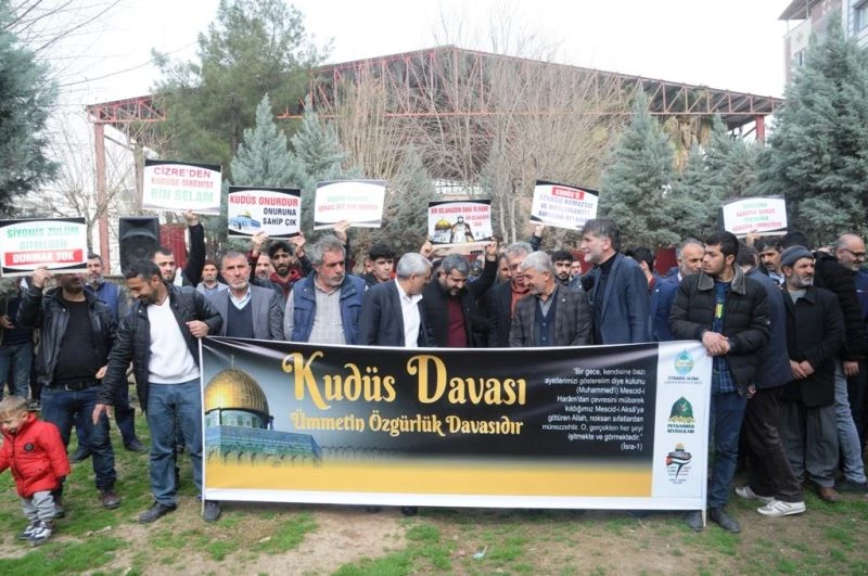 Cizre’de Peygamber Sevdalıları Vakfı’nın öncülüğünde bir araya gelen Cizreliler, İsrail’in Mescidi Aksa’ya ve Kudüs’e yönelik saldırılarına tepki gösterdi. Nuh Nebi Camii önünde bir araya gelen kalabalık adına açıklama yapan vakıf gönüllüsü Abdullah Kurami, “Kudüs davası ümmetin tüm unsurlarının ortak davasıdır. Ümmetin ilk kıblesi Kudüs on yıllardır ümmetin en şedit düşmanlarının esareti altında inliyor, Siyonist katillerin kirli çizmeleri altında eziliyor. Kudüs’ün esareti ümmetin esaretidir. Kudüs’ün kurtuluşu ümmetin kurtuluşudur. Kudüs davası ümmetin ortak davasıdır” dedi.