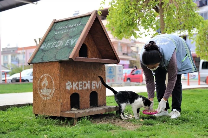 Pamukkale Belediyesi, sokak hayvanları için kedi ve köpek kulübeleri yaparken, sokaktaki canlar için yem ile su servisi yapıyor.