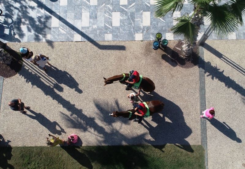 Antalya Emniyet Müdürlüğü bağlı atlı polisler ve bisikletli martı timleri, Konyaaltı Sahili’nde görev yapan polis ekiplerine genel güvenlik ve asayiş konularında destek veriyor. Özellikle pandemi döneminde ek tedbirlerin alınmasıyla birlikte görev yükü artan polisin yükünü azaltan atlı polisler ve martı timleri, asayişin yanı sıra sahildeki sosyal mesafe, maske ve temizlik konularında da vatandaşlara uyarılarda bulunuyor. Sabah 10.00-12.00 ve 14.00-16.00 olmak üzere günde 4 saat çalışan atlı polisler, sahildeki tatilcilerin de ilgisini çekiyor. Tatilciler, devriye halindeki polislere yanaşıp atlarla birlikte fotoğraf çekinebilmek için adeta yarışıyor.