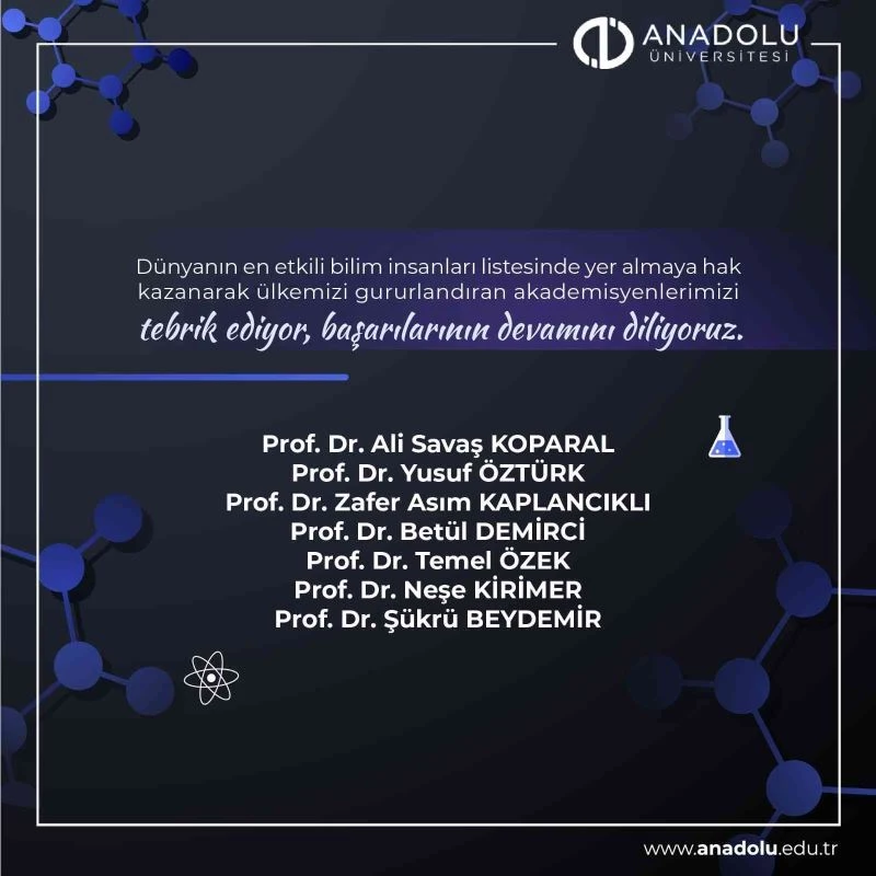 Dünyanın en etkili bilim insanları listesinde yer almaya hak kazanan ve hem Türkiye’yi hem de Anadolu Üniversitesi’ni gururlandıran Anadolu Üniversitesi öğretim üyeleri Prof. Dr. Ali Savaş Koparal, Prof. Dr. Yusuf Öztürk, Prof. Dr. Zafer Asım Kaplancıklı, Prof. Dr. Betül Demirci, Prof. Dr. Temel Özek, Prof. Dr. Neşe Kirimer, Prof. Dr. Şükrü Beydemir yaptıkları çalışmalarla bilim dünyasına ışık tutuyor.
