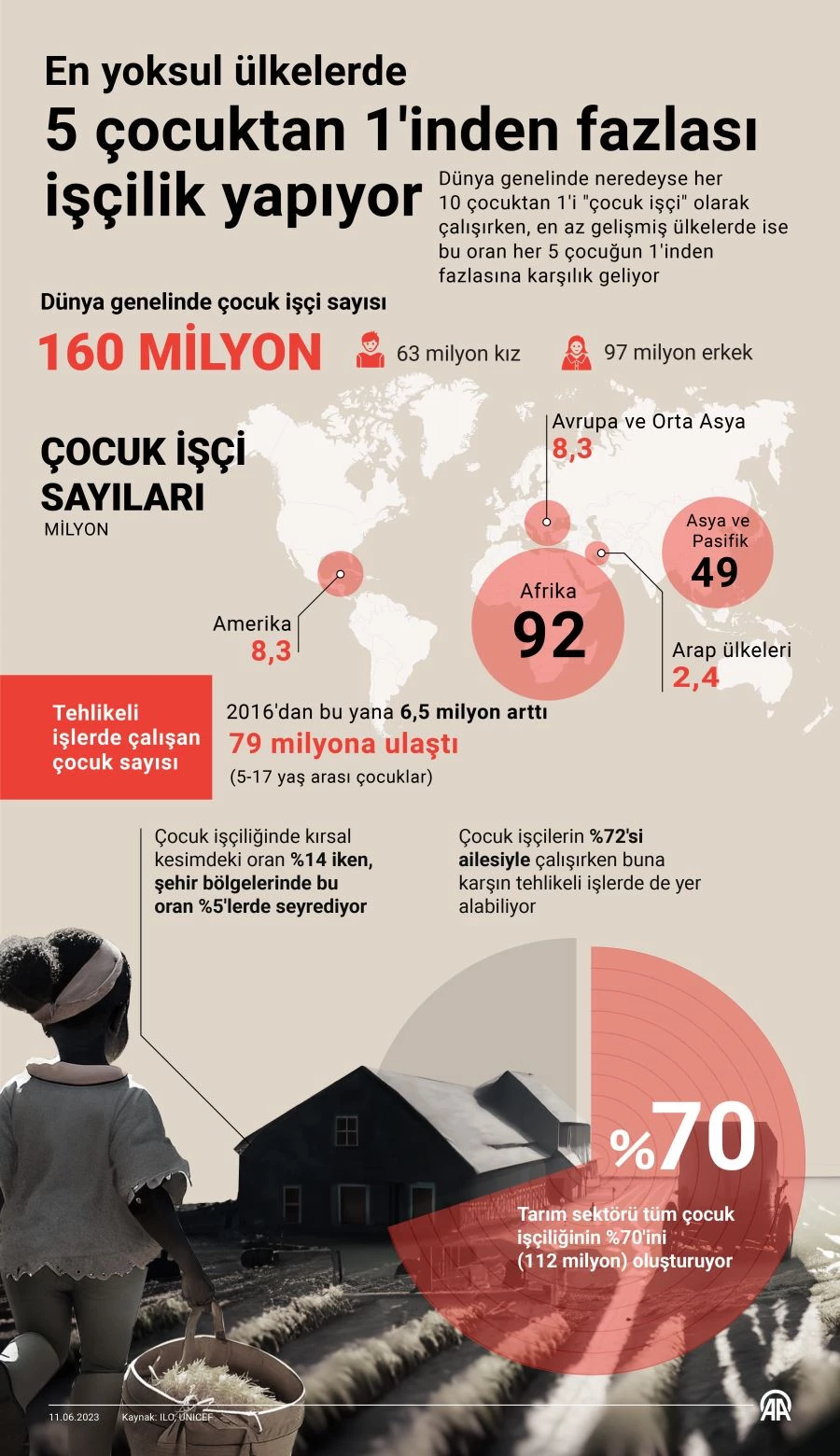 Dünya genelinde neredeyse her 10 çocuktan 1'i "çocuk işçi" olarak çalışırken, en az gelişmiş ülkelerde ise bu oran her 5 çocuğun 1'inden fazlasına karşılık geliyor.