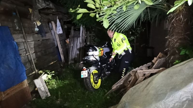 Düzce’de gece saatlerinde hareketli anlar yaşandı. Düzce Akçakoca D-655 Karayolu Yığılca Işıklı kavşakta ilerleyen 81 plakalı motosiklet sürücüsü trafik ekiplerinin ’dur’ ihtarına uymayarak, kaçmaya başladı. Önünü kesmeye çalışan trafik ekiplerinin üzerine motosikleti süren sürücü ara sokaklara saparak kaçmaya başladı. Polisin amansız takibinden kaçamayacağını anlayan sürücü Sancaklar Mahallesi Torlak Sokak’ta bir evin bahçesine motosikletini bırakarak kaçtı. Motosikleti takip eden polis ekipleri, terk edilmiş halde buldukları motor üzerinde inceleme yaparak, motosiklet plakasına cezai işlem uyguladılar. Ardından motosiklet, çekici ile otoparka çekildi.