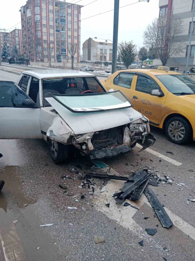 Eskişehir’de trafik ışıklarında bekleyen hafif ticari araca çarpan Tofaş marka aracın ön kısmı paramparça oldu.