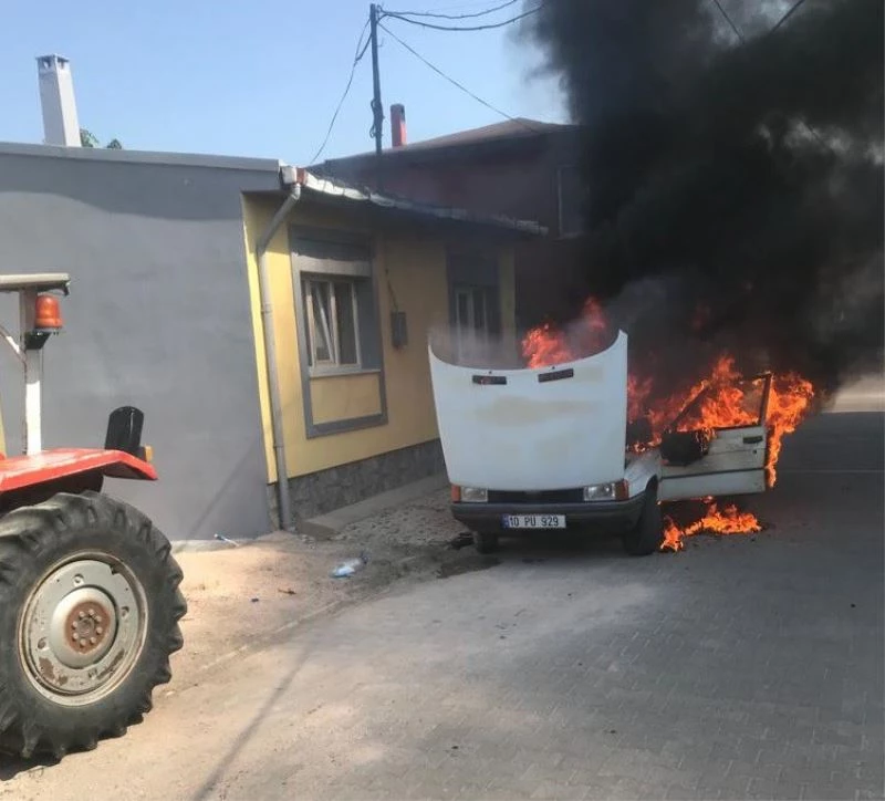 Balıkesir’in Bandırma ilçesine bağlı Edincik Mahallesi’nde duran araç motor kısmından alev aldı.