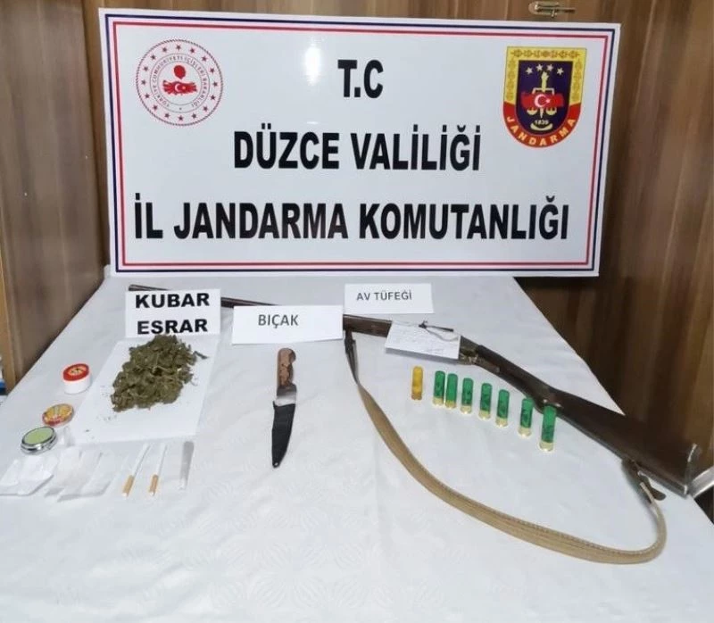 Düzce Merkez ilçe jandarma komutanlığı ekipleri tarafından Akınlar Mahallesinde devriyesi esnasında durdurulan T. E. isimli şahsın üst aramasında 50 gram kubar esrar, çantasında da 30 santim uzunluğunda ekmek bıçağı olarak tabir edilen kesici alet ele geçirilmiştir. Şahsa ait konut ve eklentilerine adli arama sonucunda da 1 adet seri numarasız ruhsatsız tek kırma av tüfeği ile 8 adet 16 kalibre fişek bulundu. Olayla ilgili olarak tahkikat başlatıldı.