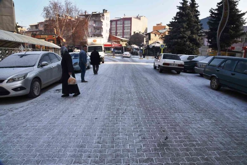 Dursunbey’de etkili olan hafif kar yağışı sonrası hava sıcaklığının-9 derecelere düşmesi buzlanmaya sebep oldu.