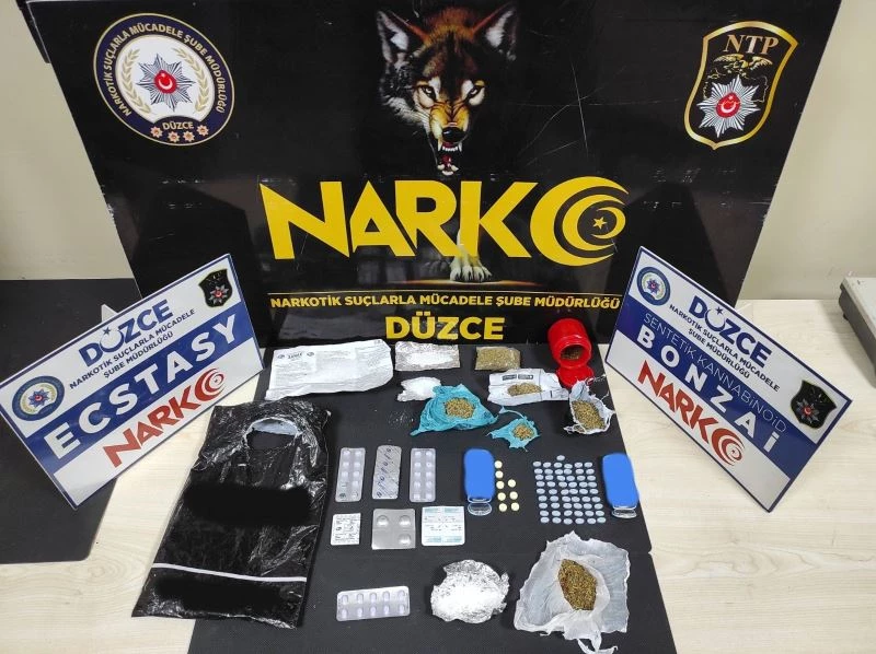 Düzce İl Emniyet Müdürlüğü Narkotik Suçlarla Mücadele Şube Müdürlüğü ekiplerince, Cumhuriyet Başsavcılığı koordinesinde yürütülen çalışmada; uyuşturucu madde ticareti yaptığı tespit edilen şüpheli 3 şahıs yapılan operasyonda yakalandı. Şüpheli şahısların üzerilerinde ve ikametlerinde yapılan aramalarda 34 gram esrar maddesi, 88 gram metamfetamin maddesi, 57 gram sentetik kannabinoid maddesi, 62 adet Sentetik Ecza ve 63 adet Extacy hap ele geçirildiler.