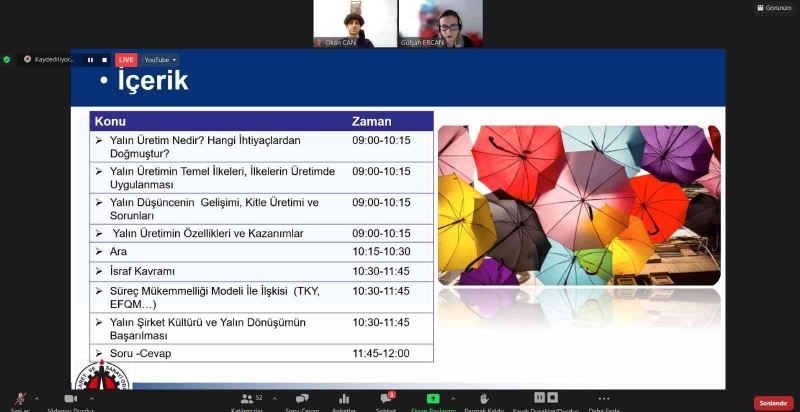 Düzce Ticaret ve Sanayi Odası ev sahipliğinde düzenlenen seminere; çok sayıda katılımcı hazır bulundu. Online gerçekleştirilen seminerde Eğitmen Gülşah Ercan, katılımcılara yalın nedir, hangi ihtiyaçlardan doğmuştur, yalın düşüncenin gelişimi, kitle üretimi ve sorunları, yalın düşüncenin temel ilkeleri, ilkelerin üretimde uygulanışı, kazanımları, yalın üretimin özellikleri, süreç mükemmelliği modelleri ile ilişkisi 6 sigma, yalın şirket kültürü, yalın dönüşümün başarılması hakkında bilgiler aktardı. Program, katılımcıların sordukları soruların cevaplandırılmasından sonra sona erdi.