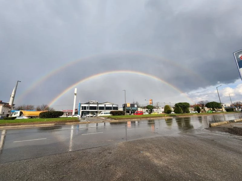 Düzce’de yağmurun ardından oluşan çifte gökkuşağı vatandaşları hayran bıraktı.