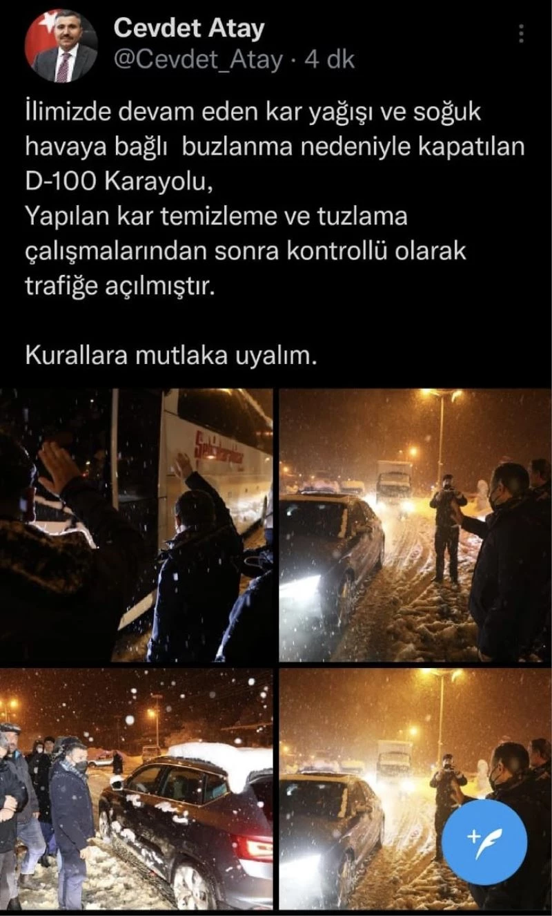 Düzce Valisi Cevdet Atay, kar yağışı ve soğuk havaya bağlı buzlanma nedeniyle kapatılan D-100 Karayolunun, yapılan kar temizleme ile tuzlama çalışmalarından sonra kontrollü olarak trafiğe açıldığını duyurdu. Vali Atay sosyal medya hesabı üzerinden yaptığı paylaşımda, “İlimizde devam eden kar yağışı ve soğuk havaya bağlı buzlanma nedeniyle kapatılan D-100 Karayolu yapılan kar temizleme ve tuzlama çalışmalarından sonra kontrollü olarak trafiğe açılmıştır. Kurallara mutlaka uyalım” ifadelerine yer verdi.
