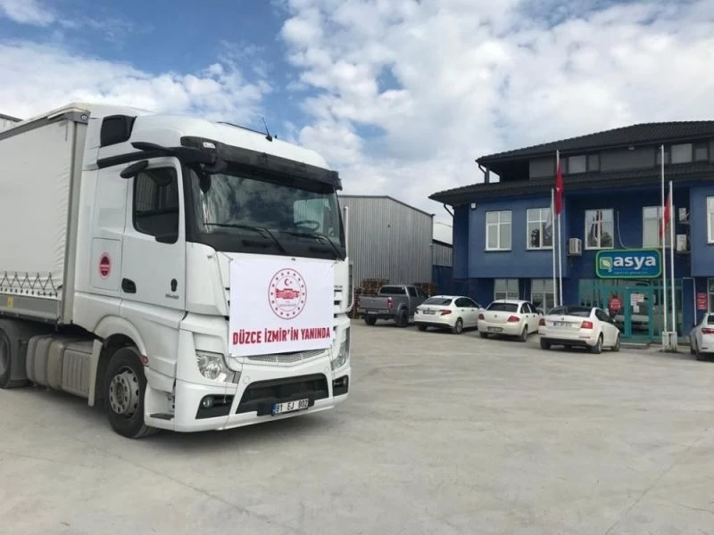 Düzceliler merkez üssü Seferihisar olan ve İzmir merkez’de çok sayıda binanın yıkıldığı depreme kayıtsız kalamadı. Depremzedeler için seferber olan Düzce’de Valilik koordinesinde su üretimi yapan Asya Su firması ile Düzce Kamyoncular ve Taşıyıcılar Kooperatifi ortaklığında 1 tır içme suyu İzmir’e gönderildi. İzmir’e gönderilen tır’da, 8 bin 64 adet 1,5 litre ve 26 bin 208 adet 0,5 litreik şişeler olmak üzere toplamda 25 ton 200 litre içme suyu depremzedeler için hazırlandı. Hazırlanan 25 bin 200 litrelik içme suyu Düzce Kamyon ve Tır Motorlu Taşıyıcılar Kooperatifinin tahsis ettiği tıra yüklendi. Düzce Valiliği tarafından İzmir’e gönderilen yardım tırı hakkında yapılan yazılı açıklamada, “Acımız ortak. Depremin yol açtığı acıyı bir nebze de olsa dindirmek, depremden etkilenen vatandaşlarımıza destek olmak için yardım tırımızı deprem bölgesine göndermiş bulunuyoruz. Düzce tek vücut İzmir’in yanında” ifadelerine yer verildi.