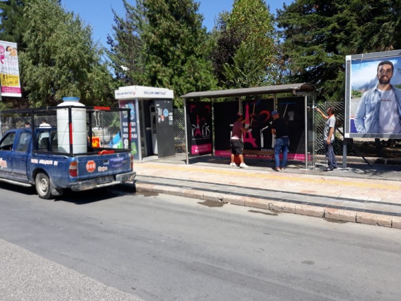 Periyodik aralıklarla sürdürülen duraklarındaki temizlik çalışmaları korona virüsü nedeniyle daha da sıklaştırıldı. Dezenfektanlı su ile yapılan temizlik çalışmaları ile vatandaşların duraklarda daha temiz bir ortamda ulaşımlarını sağlayacak otobüs ve dolmuşları beklemeleri sağlanıyor.