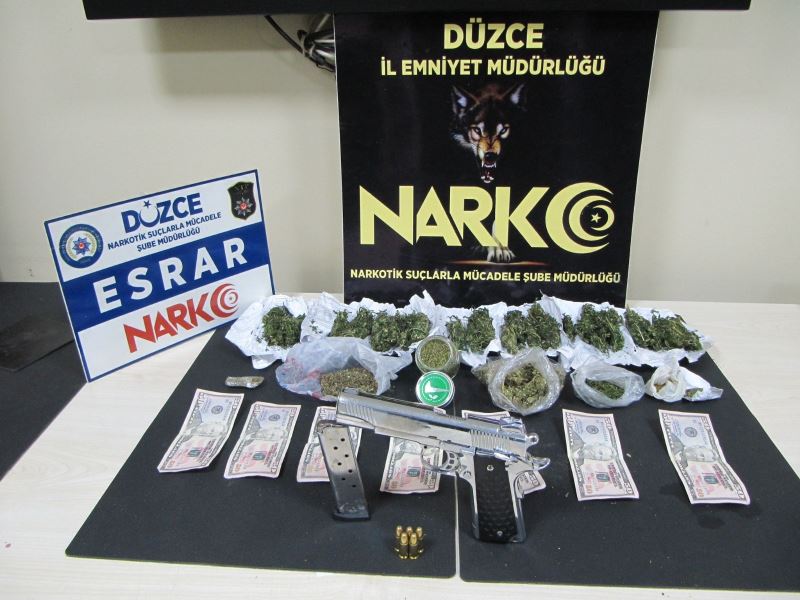 DÜZCE – Düzce İl Emniyet Müdürlüğü Narkotik Suçlarla Mücadele Şube Müdürlüğü ekiplerince yapılan operasyonda 412 gram esrar, 8 gram toz esrar, ruhsatsız tabanca ve 350 7 adet 50’lik sahte dolar yakalandı.