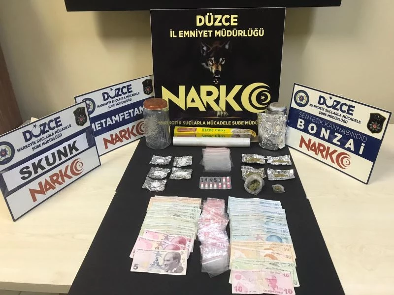 Düzce İl Emniyet Müdürlüğü Narkotik Suçlarla Mücadele Şube Müdürlüğü ekipleri Beyciler Mahallesi’nde uyuşturucu operasyonu gerçekleştirdi. Yapılan operasyonda 2 şüpheli şahıs yakalanırken, şahısların üzerinde, ikamet ve araçlarında yapılan aramada 5 parça halinde toplam 5 gram metamfetamin, 4 parça toplam 4 gram esrar, 2 parça toplam 8 gram skunk, 9 adet sentetik ecza, 160 adet uyuşturucu madde paketlemede kullanılan kilitli poşet ve alüminyum folyo ile uyuşturucu madde ticaretinden elde edildiği düşünülen 3 bin 165 lira ele geçirildi. Şahıslar, uyuşturucu madde ticareti suçundan sevk edildikleri adli makamlarda tutuklanarak Çilimli Cezaevine gönderildi.