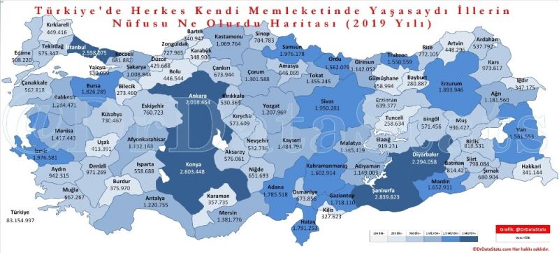 Türkiye’de herkes kendi ilinde yaşasaydı Türkiye’nin en kalabalık ili İstanbul olmayacaktı. Türkiye’nin en kalabalık ili Şanlıurfa olacaktı. İkinci en kalabalık ilimiz Konya üçüncü sırada ise İstanbul olacaktı. En kalabalık üçüncü şehir olacak İstanbul’un nüfusu ise 2 milyon 540 bin 686 olacaktı. Düzce’de ise nüfus 429 bin 688 olacaktı. Diyarbakır dördüncü, Ankara beşinci ve İzmir altıncı kalabalık şehir olarak listede yer alacaktı. 2019 yılında nüfusu 83 milyon 154 bin 997 kişi olan Türkiye’nin nüfusu daha dengeli dağılmış olacaktı.
