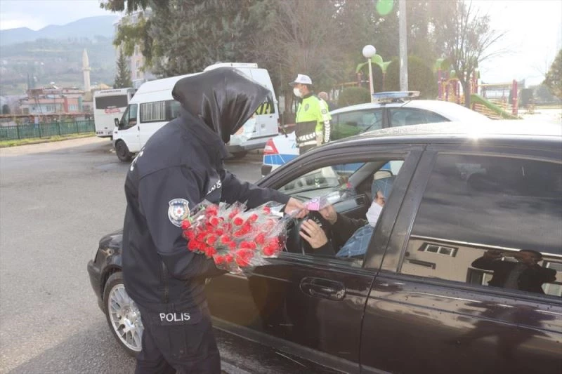 Araçları durduran polisler, kadınların 8 Mart Dünya Kadınlar Günü’nü kutlayarak karanfil verdi.