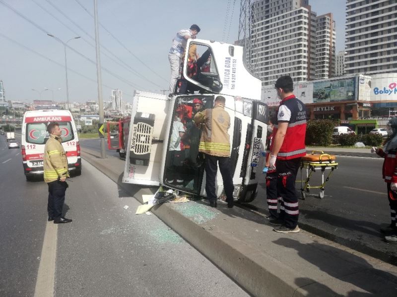 Olay, saat 09.30 sıralarında E-5 Esenyurt Haramidere mevkisi Beylikdüzü istikametinde yaşandı. Edinilen bilgiye göre, gıda taşıyan bir kamyonet yan yol üzerinde sulama yapılan çimlerden akan su nedeniyle kaydı. Sürücüsünün kontrol hakimiyetini kaybettiği 34 TL 2702 kamyonet yan yol ayrımı taşına doğru devrildi. Kamyonet sürücüsü yara almadan araç içinden çıktı yan koltuktaki kişi ise sıkıştı. Çevredeki vatandaşların ihbarı üzerine olay yerine polis, itfaiye ve sağlık ekipleri geldi. Ekipler araç içinde hareket edemeyen kişiyi kurtarmak için kamyonetin içine girdi. Kamyon içinde travma sedyesine bağlanan şahıs, itfaiye tarafından ön cam kırılarak dışarıya çıkarıldı. Ambulans ile hastaneye götürülen şahsın sağlık durumunun iyi olduğu öğrenildi.