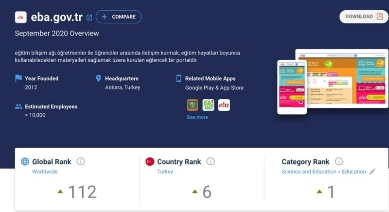 Salgın sürecinde ulusal ölçekte uzaktan eğitimin yürütüldüğü EBA, 2020-2021 eğitim öğretim yılı birinci dönem istatistiklerini geride bırakarak kullanım miktarı ve internet trafiği kriterlerine göre eğitim alanındaki tüm siteler arasında dünyada 1. sıraya yükseldi.